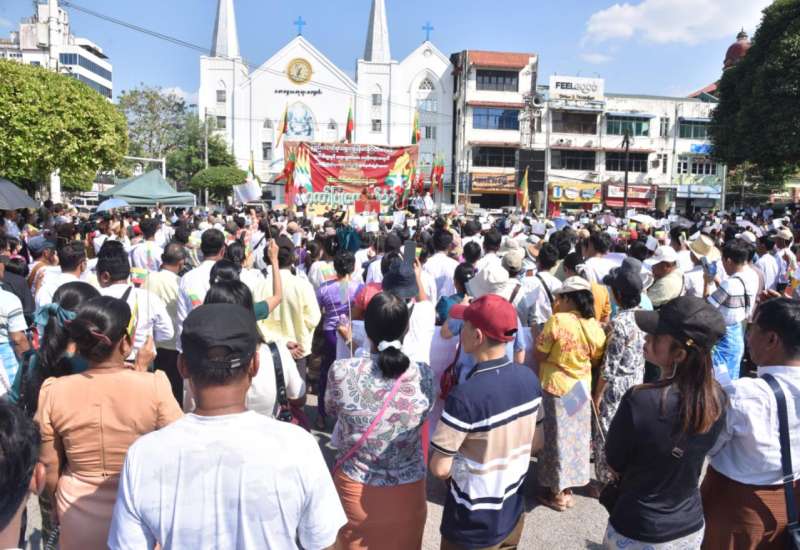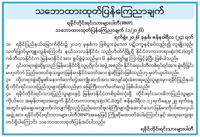 ပြည်ထောင်စုသမ္မတမြန်မာနိုင်ငံတော်၏ ဂုဏ်သိက္ခာနှင့် တရားမျှတသော အမှန်တရားအတွက် နယ်သာလန်နိုင်ငံ၊ သည်ဟိတ်ဂ်မြို့၊ အပြည်ပြည်ဆိုင်ရာတရားရုံး (ICJ) ၌ သွားရောက်ဖြေရှင်းနေသော မြန်မာကိုယ်စားလှယ်အဖွဲ့၏ လျှောက်လဲချေပချက်များအား ထောက်ခံဂုဏ်ပြုပွဲနှင့် ဂမ်ဘီယာနိုင်ငံ၏ မဟုတ်မမှန်စွပ်စွဲချက်များကို ကန့်ကွက်ရှုတ်ချသည့် အမျိုးသားရေးဆန္ဒထုတ်ဖော်ပွဲကို ယနေ့မွန်းလွဲပိုင်းတွင် ရန်ကုန်မြို့၊ မြို့တော်ခန်းမရှေ့၊ ယာဉ်ရပ်နားကွင်း၌ ပြုလုပ်ရာ မျိုးချစ်မြန်မာရဟန်းတော်များသမဂ္ဂမှ သံဃာတော်များ၊ သာသနာနွယ်ဝင် သီလရှင်များ၊ ပြည်သူများ၊ နိုင်ငံရေးပါတီများမှ ပါတီဝင်များ တက်ရောက်ကြသည်။