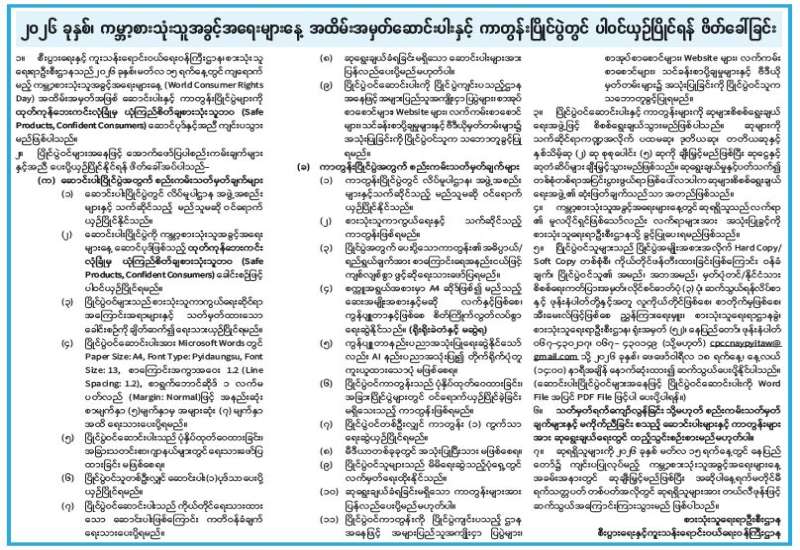 ၂ဝ၂၆ ခုနှစ်၊ ကမ္ဘာ့စားသုံးသူအခွင့်အရေးများနေ့အထိမ်းအမှတ် ဆောင်းပါးနှင့် ကာတွန်းပြိုင်ပွဲတွင် ပါဝင်ယှဉ်ပြိုင်ရန် ဖိတ်ခေါ်ခြင်း