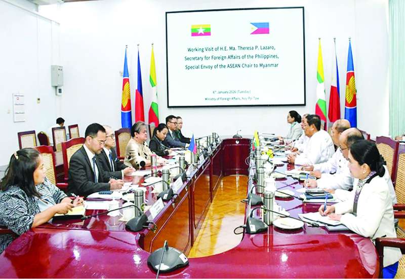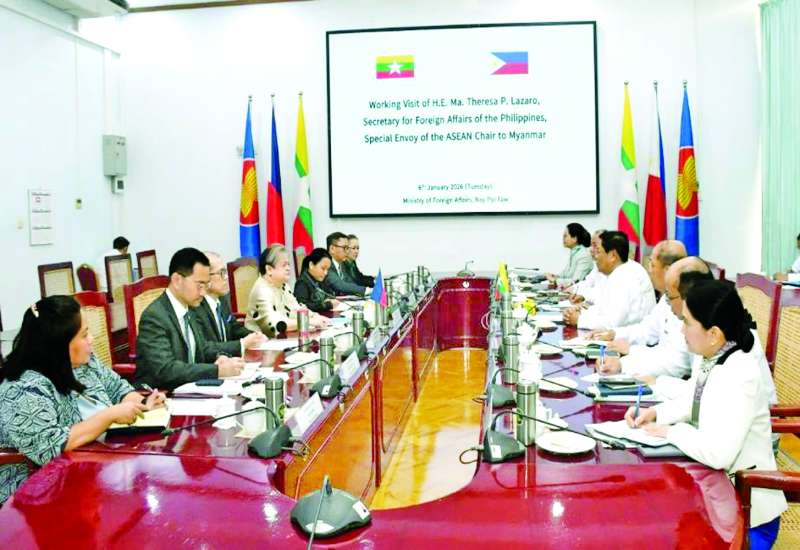 နိုင်ငံခြားရေးဝန်ကြီးဌာန ပြည်ထောင်စုဝန်ကြီး ဦးသန်းဆွေသည် ဇန်နဝါရီ ၅ ရက်မှ ၇ ရက်အထိ မြန်မာနိုင်ငံသို့ အလုပ်သဘောခရီးစဉ် လာရောက်သည့် အာဆီယံဥက္ကဋ္ဌ၏ မြန်မာနိုင်ငံဆိုင်ရာ အထူး ကိုယ်စားလှယ် ဖိလစ်ပိုင်နိုင်ငံခြားရေးဝန်ကြီး H.E. Ms. Maria Theresa Parreno Lazaro ဦးဆောင်သည့် ကိုယ်စားလှယ်အဖွဲ့အား ယနေ့တွင် နေပြည်တော်ရှိ နိုင်ငံခြားရေးဝန်ကြီးဌာန၌ တွေ့ဆုံသည်။